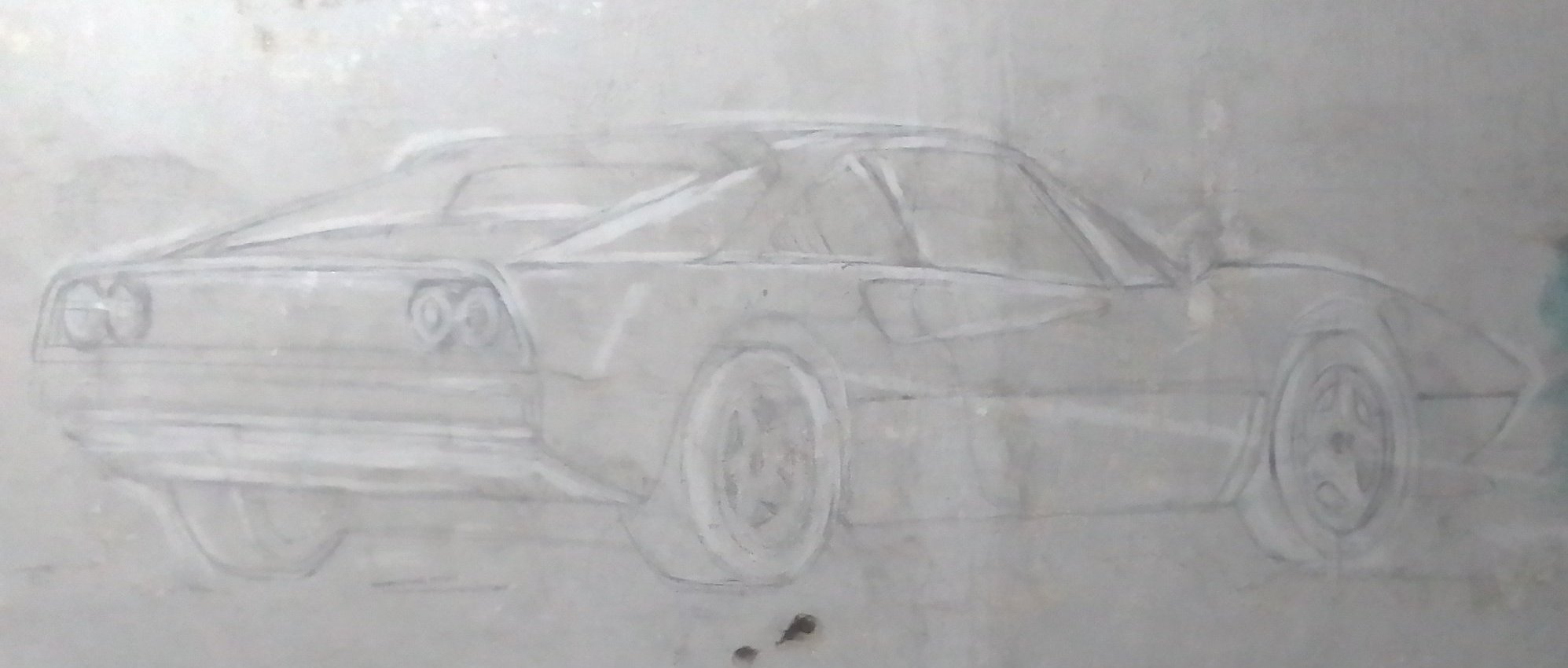 Domani inizio a colorarla. Dimensioni: 2 metri e 20 X 70 cm. Realizzata a matita su muro, riproducendo una fotografia a occhio e mano libera, con il metodo della quadrettatura
